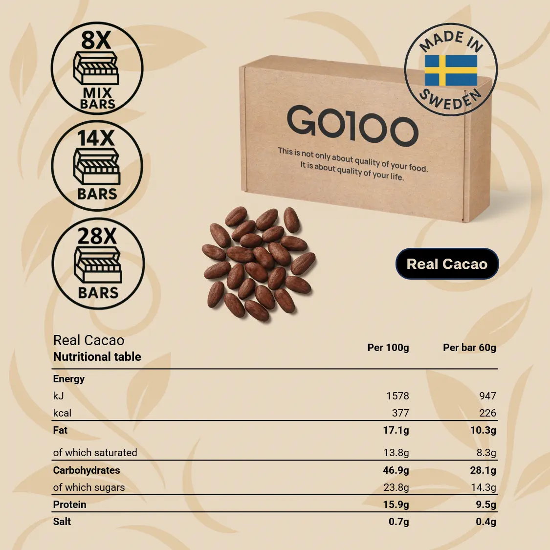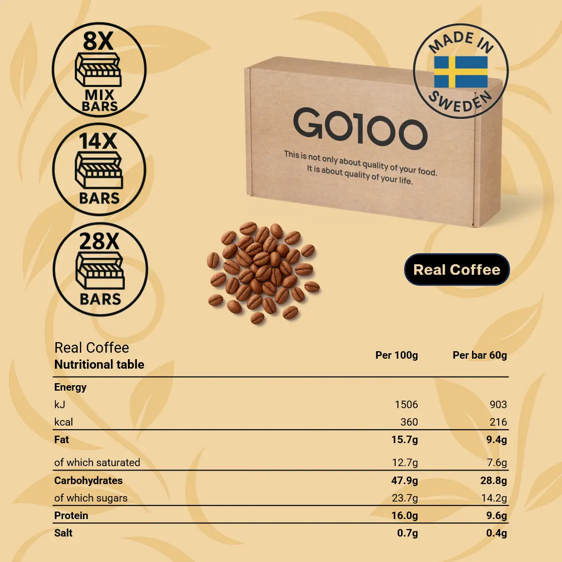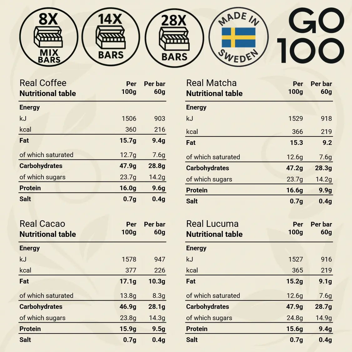 Our bars contain only natural flavors from real coffee beans, cocoa beans, matcha leaves, and lucuma fruit. This not only gives them a naturally great taste – it also means your body benefits from the nutrients naturally found in these ingredients, such as fibers, antioxidants, vitamins, and minerals.